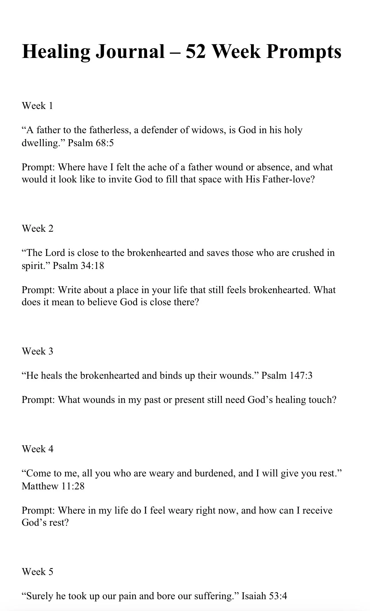 Shop Resources Healing Journal Prompts (Digital Download) $5.00 Add To Cart Added! The Healing Journal (Digital Download · $12) $12.00 Add To Cart Added! Glory Journal Prompts (Digital Download · $5) $5.00 Add To Cart Added! The Glory Journal (Digital Download · $12) $12.00 Add To Cart Added!
